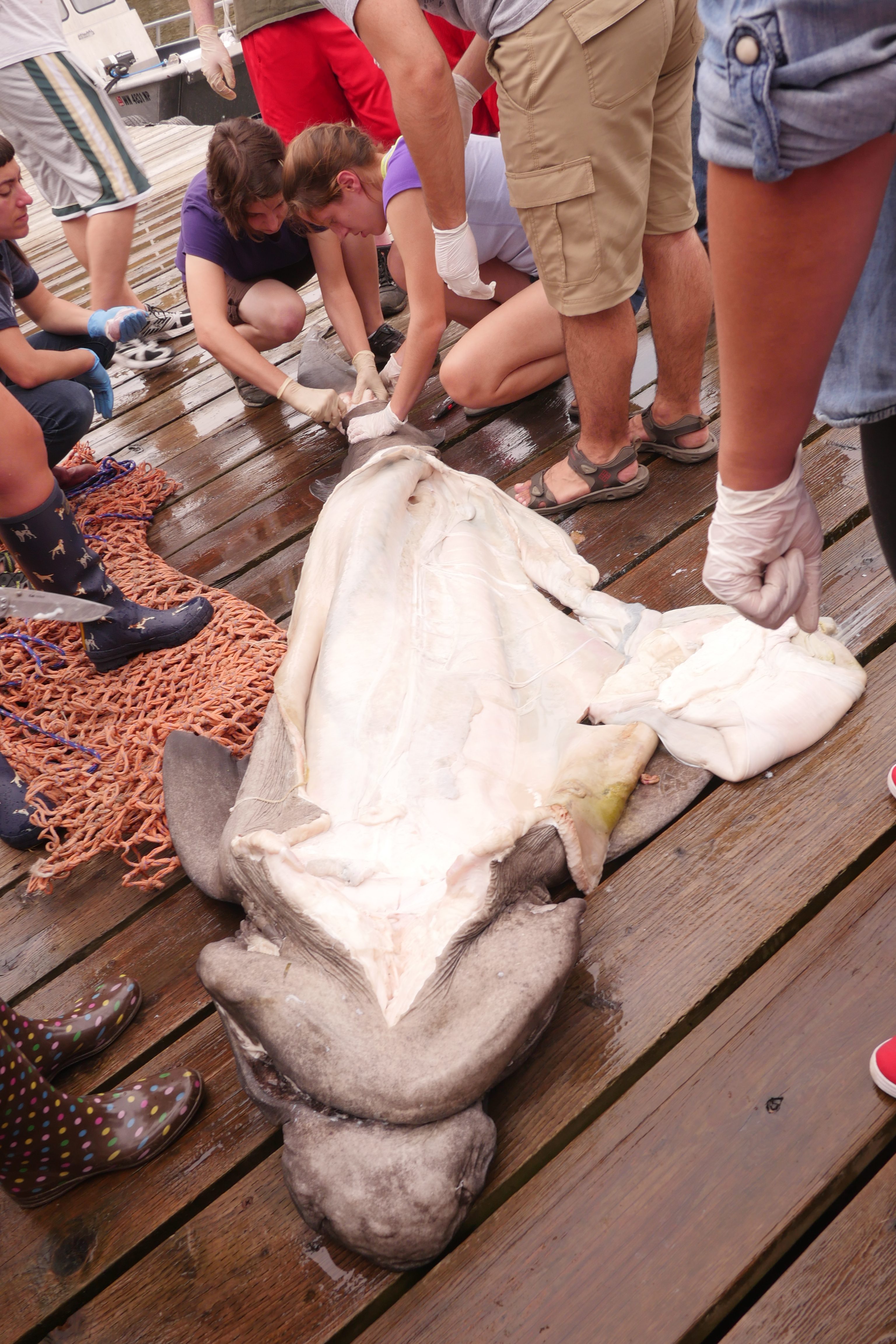 Soon it was time for the shark necropsy! Last Monday, an 8-foot 6 gill shark washed up on the beach, and Adam Summers’ class will be studying the shark’s morphology.We were lucky to be invited to observe the necropsy too. A few of us were even able to feel the liver of the shark!