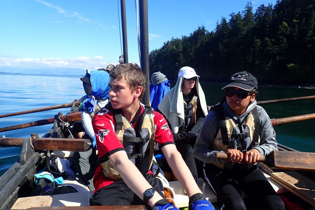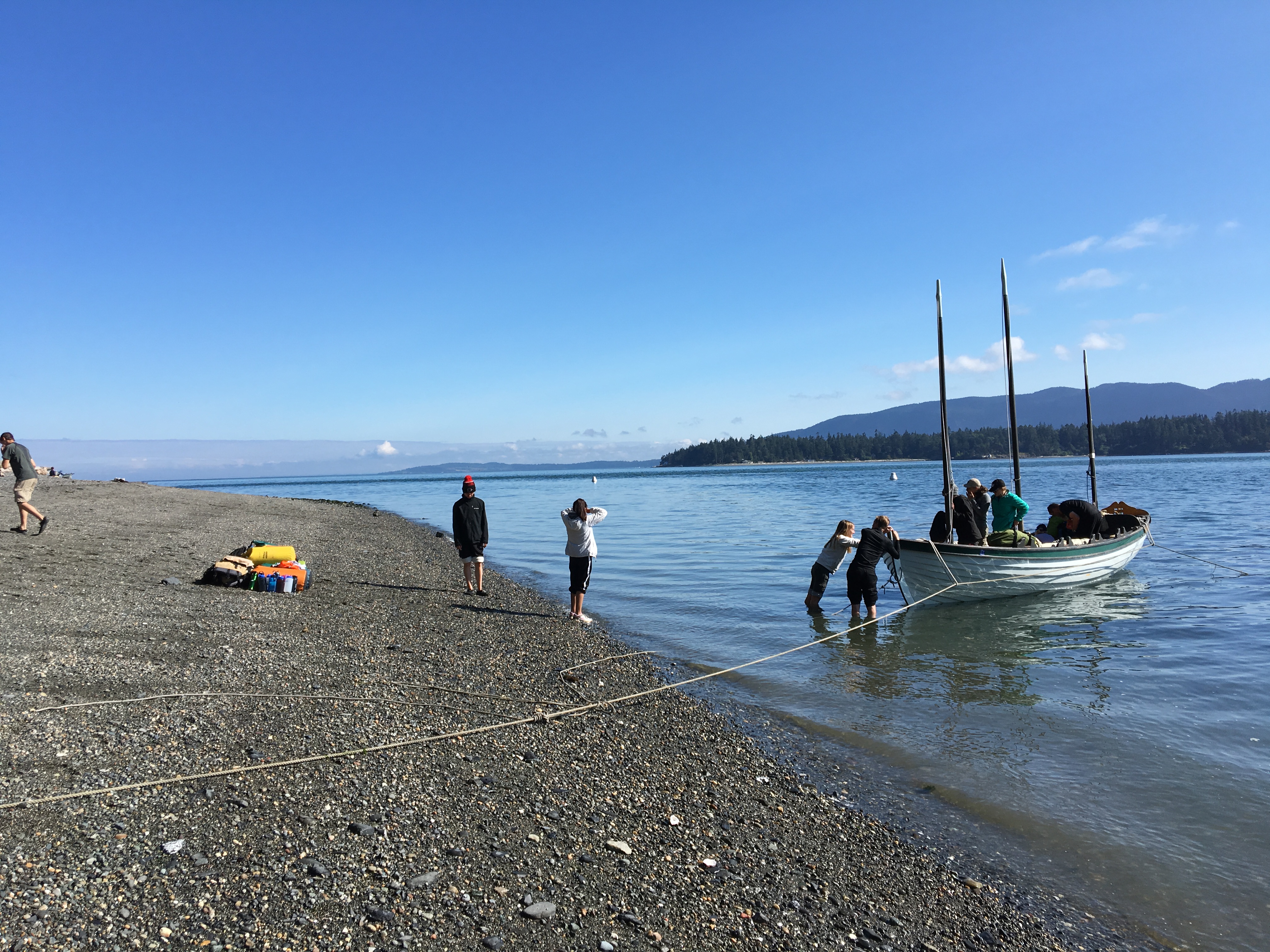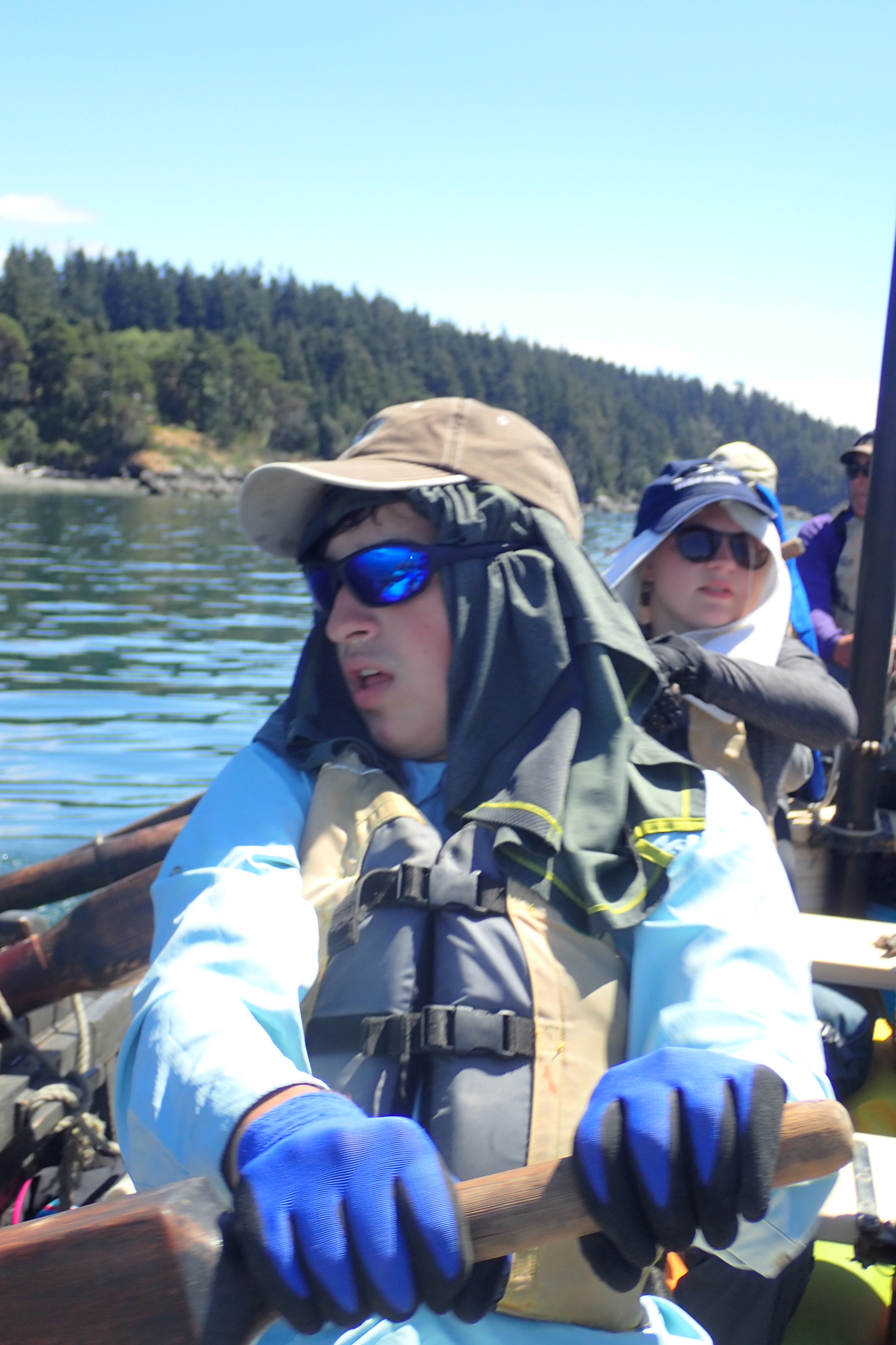 Today, our last day on the longboat expedition, we woke up at 5:30 AM for the people sleeping on the boat and 5:45 AM for those sleeping on shore. We prepared for the morning dip and quickly changed into our clothes for the day. We gathered in a circle and our Captain and Mate, Michael and Chrissy, explained our challenge for the day, which consisted of 12 tasks. Some of the tasks to be completed were: man overboard, singing a sea shanty, and 10 perfect power strokes. We then prepared for breakfast and had granola, yogurt, and almond milk. After breakfast, we packed the boat and it began to rain, making the day even more challenging.