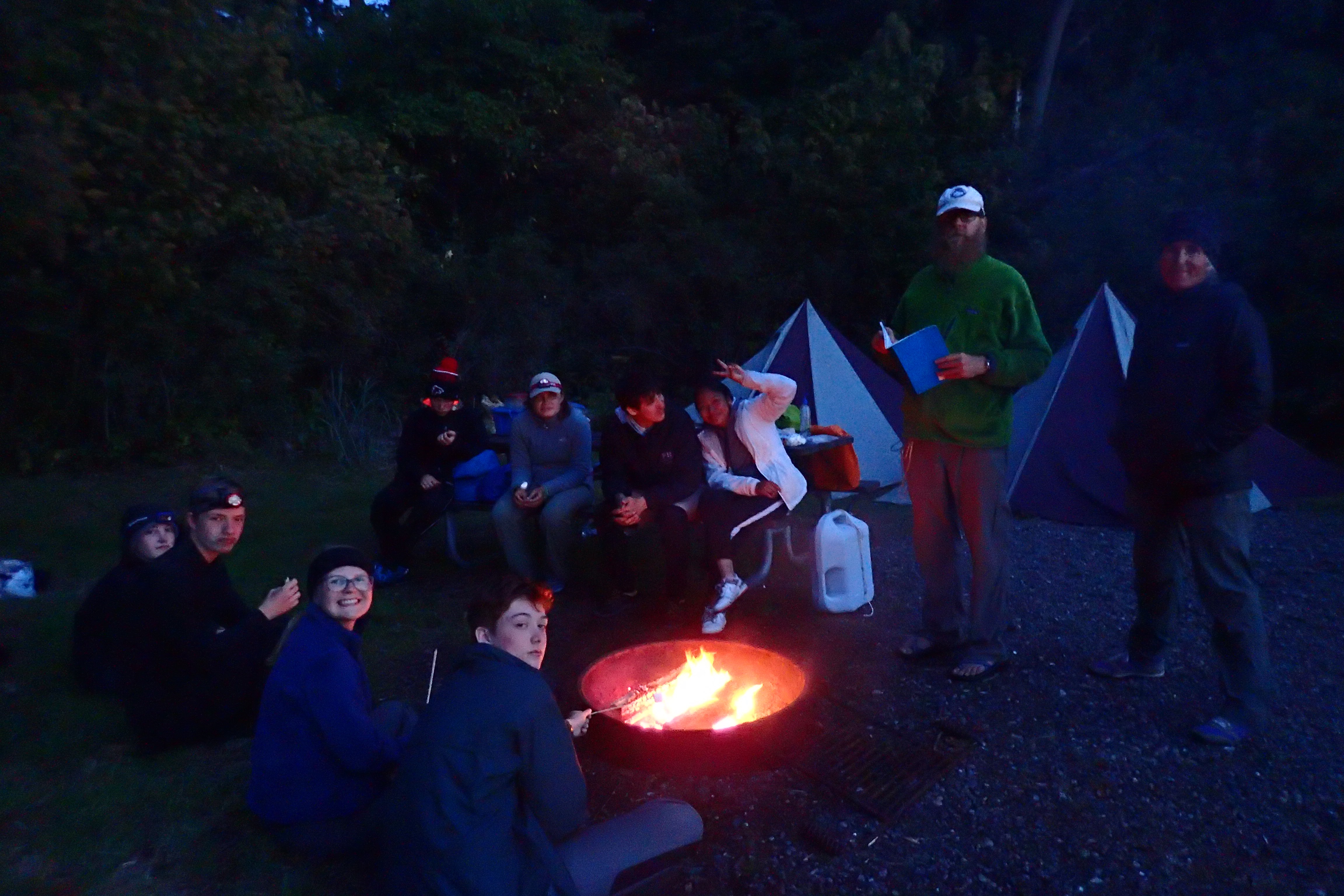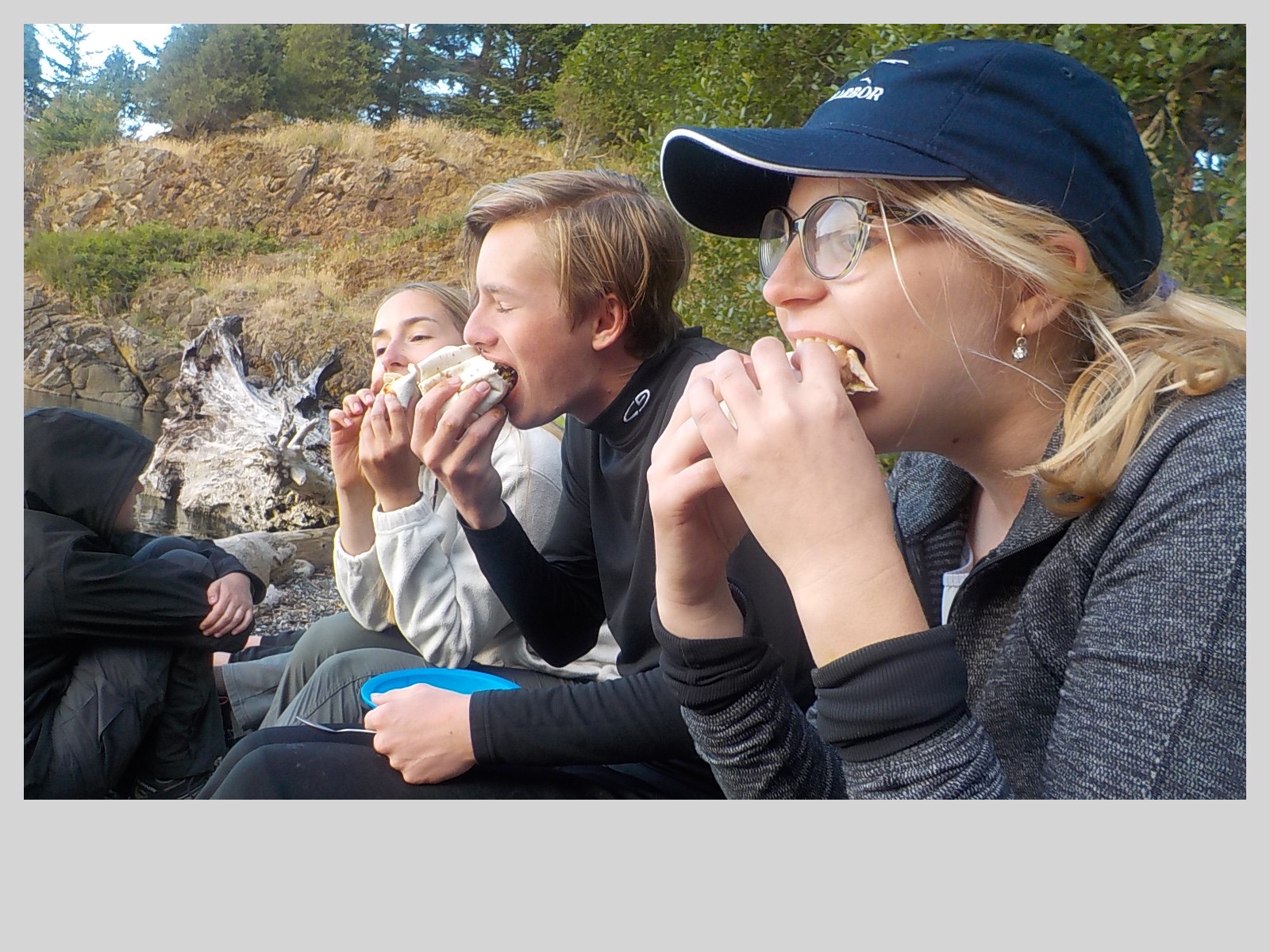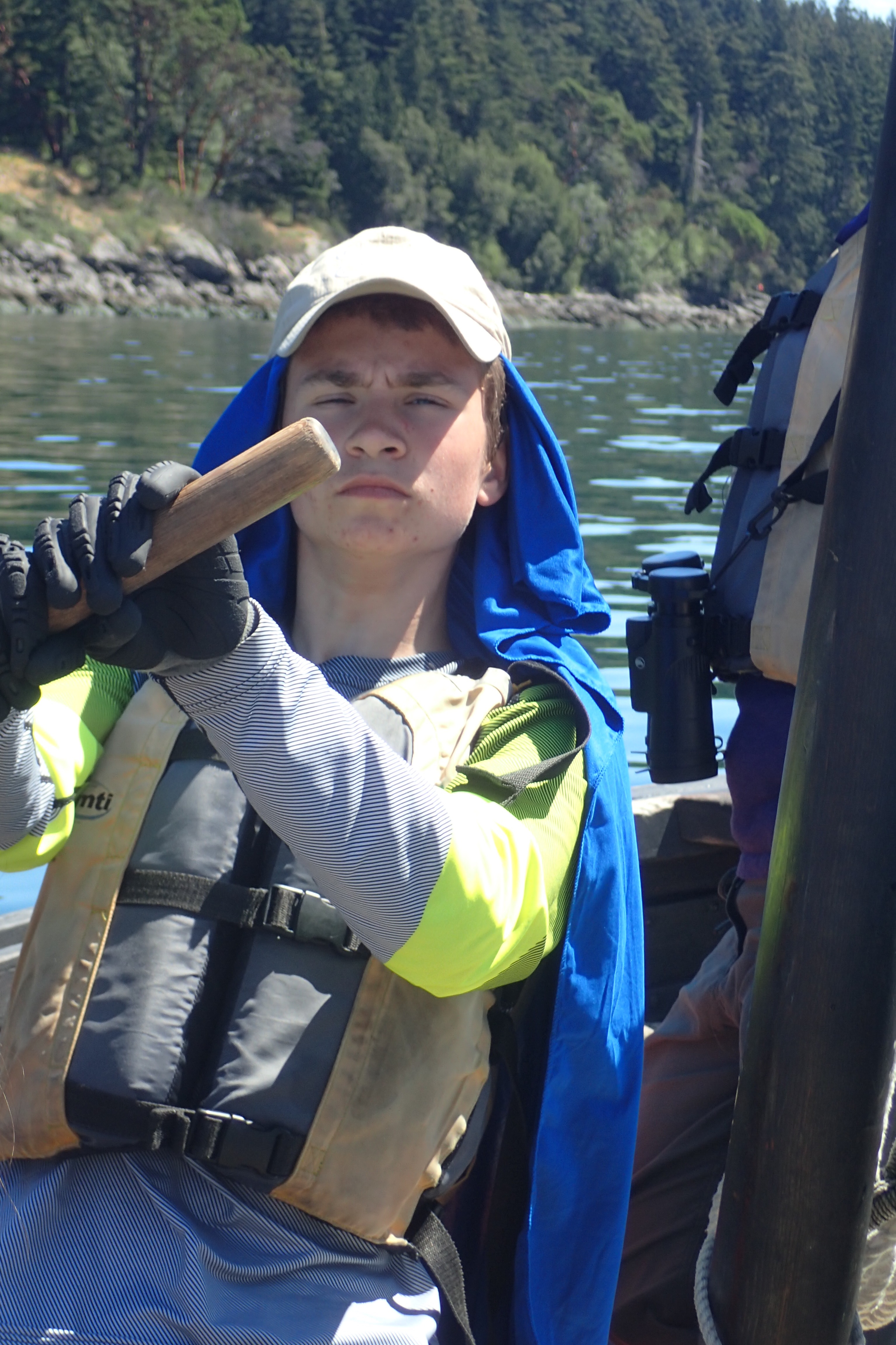 Today, our last day on the longboat expedition, we woke up at 5:30 AM for the people sleeping on the boat and 5:45 AM for those sleeping on shore. We prepared for the morning dip and quickly changed into our clothes for the day. We gathered in a circle and our Captain and Mate, Michael and Chrissy, explained our challenge for the day, which consisted of 12 tasks. Some of the tasks to be completed were: man overboard, singing a sea shanty, and 10 perfect power strokes. We then prepared for breakfast and had granola, yogurt, and almond milk. After breakfast, we packed the boat and it began to rain, making the day even more challenging.