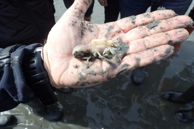 The weather and temperatures were rougher than Timmy’s puns, and the Fucus mucus made us severely question our foot-eye coordination, but we scientists are well known for our balance of fun and elbow grease. Several of us took breaks by playing with one genus of algae, Halosaccion, that squirts a thin stream of water when squeezed. Others found enormous rock crabs that were extremely interesting, as they were missing claws and legs, which gave us a look into the rough lifestyle of intertidal creatures.