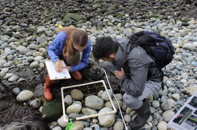 Scientist Ela and Kenneth hard at work collecting data with the help of a quadrat.