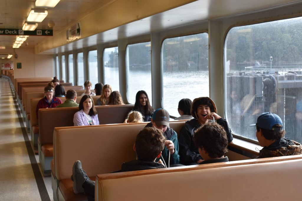 For our final step, the Townshend group helped get the longboat onto the trailer of the manager’s car. The Bear crew walked in the nice weather to the boat lift, where we watched Townshend get raised out of the water. With the longboat secured, we began our goodbyes, thanking all of the instructors for an amazing five days. We then loaded onto the Salish Sea Sciences vans, where we headed to the ferry landing. With time to kill waiting for the ferry, some people enjoyed the view or took walks along the beach. When the ferry finally was ready to board, we got out of the vans and headed upstairs, where many people took well deserved naps or sat around having conversations.
