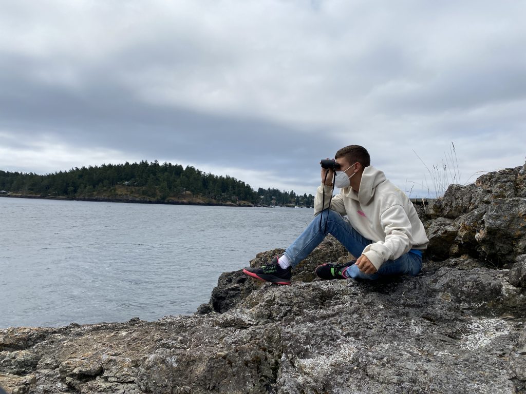 This morning, we groggily got ready and ate breakfast, before learning the knot of the day, which is useful on sailboats for attaching things. After that, we headed out to Friday Harbor Labs for another data collecting session! Those of us who already had data or couldn’t collect at FHL opted to help other people collect data instead. A few hours later, after spotting jellyfishes and surveying tide pools, we gathered at the windy observation deck, where another group was carefully looking out for whales. The whale watchers, Hebaq and Estevan, had finished their survey, and unfortunately saw nothing. However, as we gathered our stuff, ready to leave, we heard Tim excitedly point out an orca on the horizon!! We watched in awe as it came up a few times. It was an amazing way to end a tired morning.