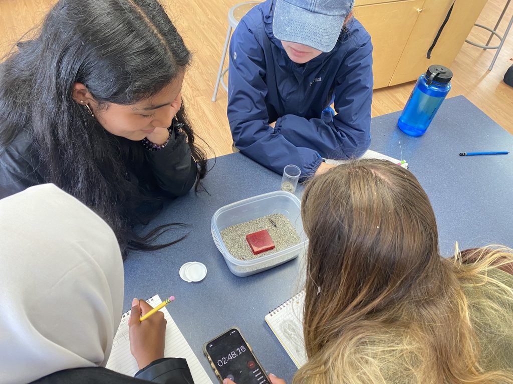 Andrea, Hebaq, Sonja, and Islay watch and record earwig behavior. (Photo: Maddy Glaser)
