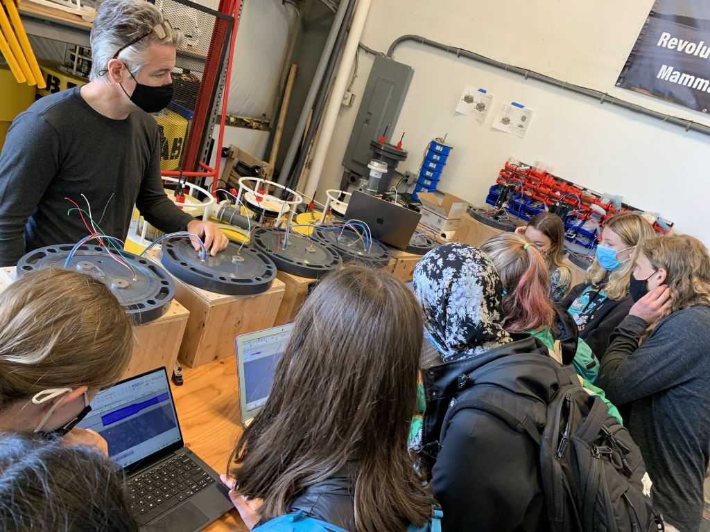 This morning we visited members of the Sea Mammal Research Unit (SMRU) in a small office/garage building less than a 10 minute walk from the dorm.  There we met Jason, who manages the North America chapter of SMRU; Jessica, who is a junior scientist; and Jesse, the field technician, who explained to us what they do related to bioacoustics.  Jason gave us an overview of the physics of sound, Jessica showed us how the computer identifies and compiles orca noises from hours of sound data from the hydrophones and Jessica reviews it.  Jesse is the technician and he constructs Coastal Acoustic Buoys which hydrophones are attached to and then deployed in the ocean.  Currently, Jesse is working on assembling CABOWs (Coastal Acoustic Buoys for Offshore Wind) for companies that are building offshore wind power on the East Coast.