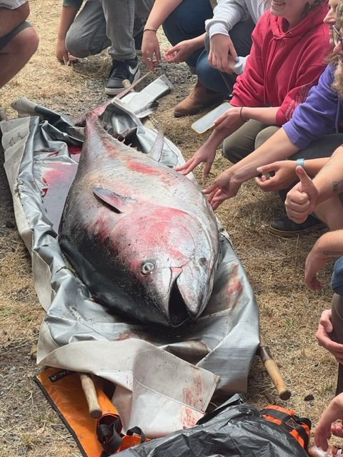 We put the organisms that we gathered in a bucket to be later taken to the labs for further inspection. As we were finishing up, a boat full of scientists came rushing back revealing a one of a kind discovery. A group of six of them carried a covered figure on a stretcher, later being told it was a giant blue fin tuna. What we didn’t realize is that we were about to witness history. Apparently, tunas are only found in warmer water which is why it was so strange to see a tuna so far up north.