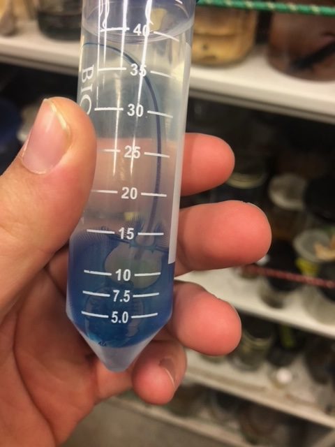 Pictured above is a dyed preserved skate specimen in a tube. The blue shows the cartilage, and the clear body is from enzymes that were injected to eat away the tissue to leave it clear to dissect. This was taken by Ingrid.