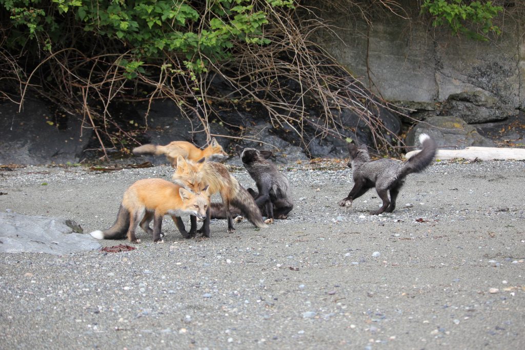 During our stay at Cattle Point, we were approached by a lone red fox along the coast. It seemed very comfortable around humans, likely due to associating humans with food, and got within a few feet of a couple of individuals. Suddenly, out of nowhere, another two red foxes descend gracefully from the cliffside, joining the lone fox. They run around the intertidal zone, playing and tackling each other until another pair of red foxes appear from the bushes, bringing the total count of foxes frolicking around to five. While watching the group of foxes, we wondered why a group of five foxes would travel together, as they are not known as pack animals. Our resident animal behavior specialist, Dr. Amy Cook, hypothesized that either it was a mating pair and their three pups or a mother-daughter pair co-raising their pups together. Alas, the truth will elude us as the red foxes escape back into the woods to live out their lives in peace.
