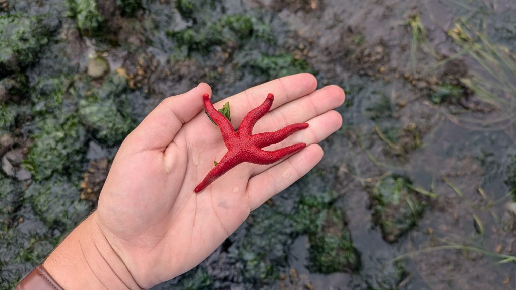 We started the day with a trip to Cattle Point where we met up with Dr. Amy Cook and took part in an exercise on pattern recognition and strong inference from our lecture with Dr. Cook the night before. Dr. Cook was very helpful and engaging with our ideas and encouraged further exploration of our interests. We all split into groups and made our way down to the beach, looking for ideas of patterns and relating hypotheses. Most of the groups wandered into the rocky intertidal zone and came up with very detailed hypotheses relating to the patterns they found. Caleb found a fully grown male red rock crab with a missing pincer in one of the deeper tide pools on the beach. We also ran into a family of five red foxes who made working around them very interesting.