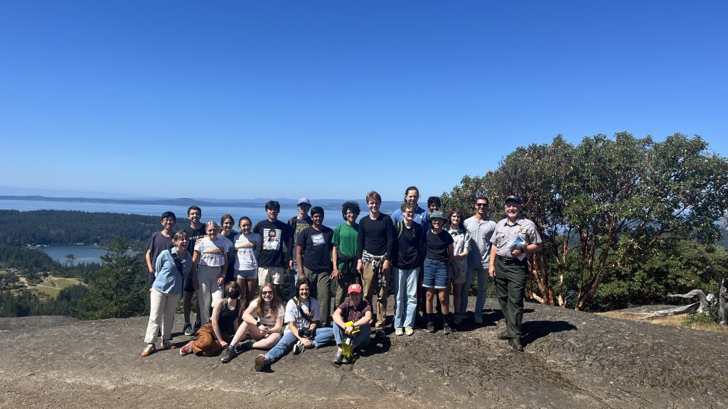 The group headed out on a tour of English Camp with Park Ranger Jeff, who gave us an in-depth look into the geology of the San Juan Islands, and the causes of development of the islands in the first place. We had a lovely hike up to the top of Young Mountain (Hill) with Ranger Jeff leading us to deeper thoughts about the geological creation of the islands. He mentioned to us how glaciers a mile high carved out the San Juan Islands. Thank you to Ranger Jeff Hodge for coming out and spending his time hiking and teaching us.