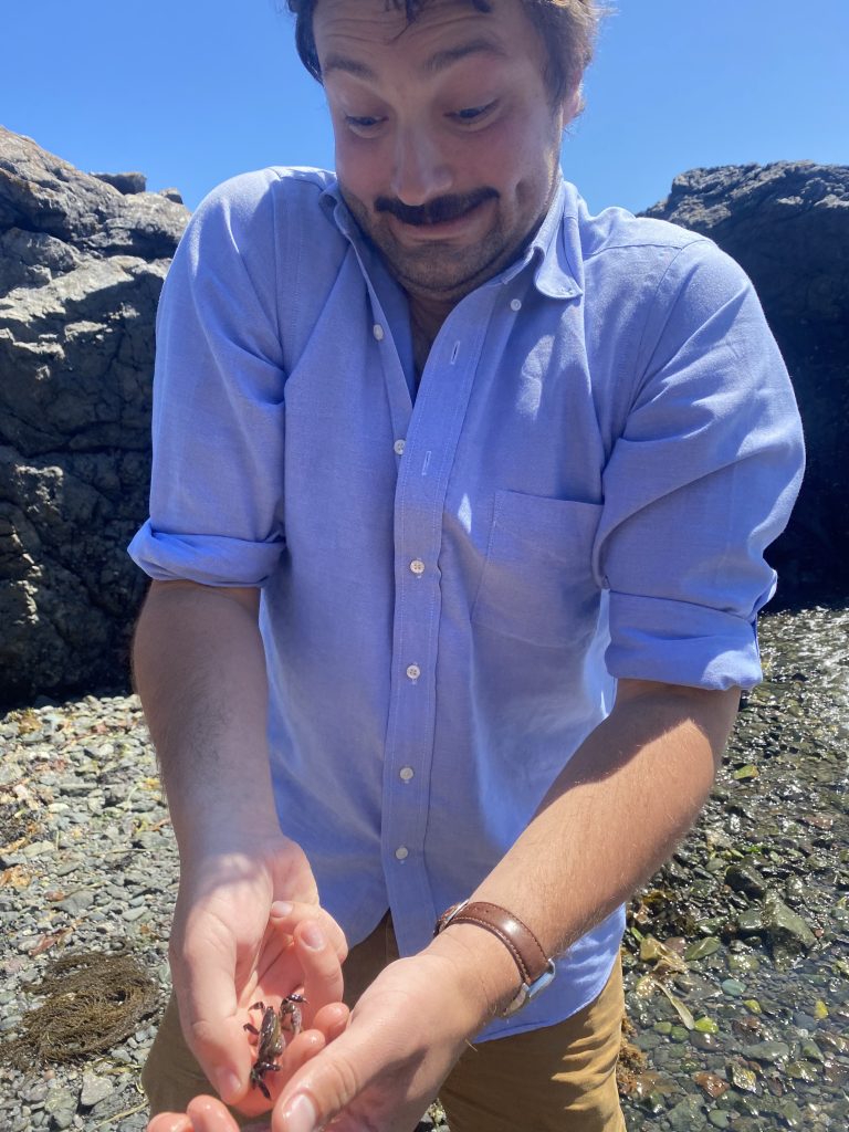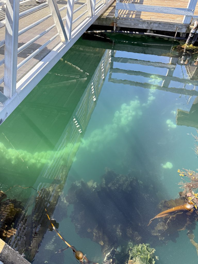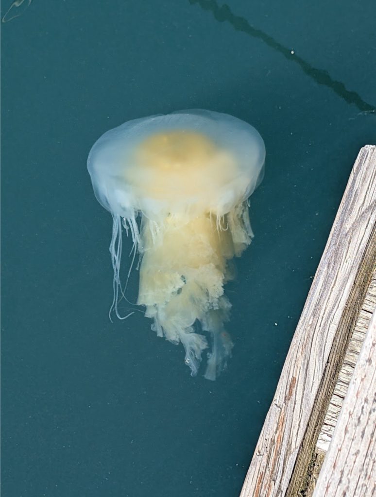 After Adam’s phylum presentation, we strolled into town to put our knowledge to use at the marina. Our main focus there was the fouling communities, which are congregations of animals found on man-made objects. We spent about an hour exploring over, under, and around the docks, searching for any organism we could find. While we were there, we had to apply our newly acquired knowledge of species and phyla to identify patterns in organism density, dispersion, and relationship to other organisms. In our full-group meetup afterwards, we all agreed that there was more seaweed on the upper section of the pilings (due to photosynthesis) and that there was a higher concentration of organisms, specifically plumose anemone, in the gaps between the dock (because of current and nutrient flow). Notably, we also saw plumose anemones, a red rock crab, and a few massive egg yolk jellyfish. Afterwards, we enjoyed a short hike back up through town and settled in for lunch.