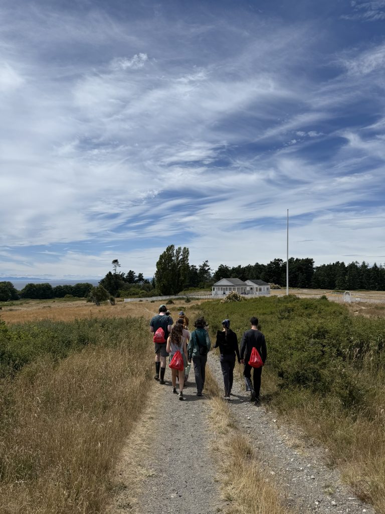 After our exciting lunch at Eagle Cove, we drove down the road to the American Camp Visitor Center at the San Juan Island National Historical Park where we met our tour guide, Emilio Santiago. Emilio works as a Cultural Resources Program Specialist for the National Park Service & he has been operating as the park’s resident archaeologist since 2018. In addition to being an engaging presenter of the park’s history, Emilio is currently campaigning for the position of Friday Harbor’s town mayor (We wish him luck!). During our tour, Emilio regaled us with a brief history of the 1859 “Pig War” which saw the American and British militaries nearly coming to blows over which of the two powers “owned” the San Juan Islands. We were shown around the foundations of the camp as well as the few remaining buildings that had been restored over the years. After this, we returned to the visitor center where we got to examine several artifacts from the various Coast Salish indigenous tribes who lived near the park prior to colonialist occupation (these being the Samish, S’Klallam, Lummi, and Lushootseed nations, among others). After saying goodbye to Emilio, we drove back to the dorms to start our next activity: brainstorming for our independent research projects.