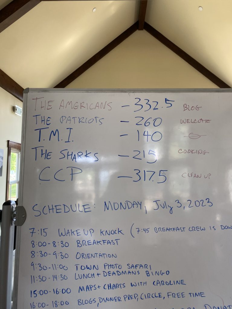 Today we woke up early at 7 to get a productive start on the day and our projects; as Bea said, today was our Project Marathon Day. We quickly ate breakfast before getting started on our projects. We started to feel the pressure, but we had help and suggestions from Bea and Adam, which greatly helped reduce our worries. After Tom Grauman, one of the founders of Salish Sea Sciences and an acclaimed photographer, gave us a talk on fish, art, and technology, we began a fierce fish quiz, which ended with all three teams tying.