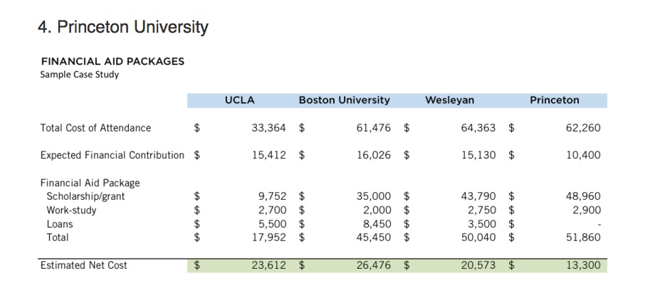 When a school’s website is too complicated, type “[schoolname] student profile” into the browser search field. For many schools, current freshman class statistics become immediately available. There, you will learn who was admitted last spring—where they are from, what their backgrounds and interests are, what their average scores were, and what percent got what kind of financial package. Here is an example from Williams College and another example from the University of Washington. This is valuable information when you are trying to decide if a school is a reach, target, or safety. It may also help you learn whether you have a shot at being able to afford it, if it seems like a school with like-minded people, and whether their strongest academic departments align with your interests. It is an excellent partner to the College Statistics Navigator (above).