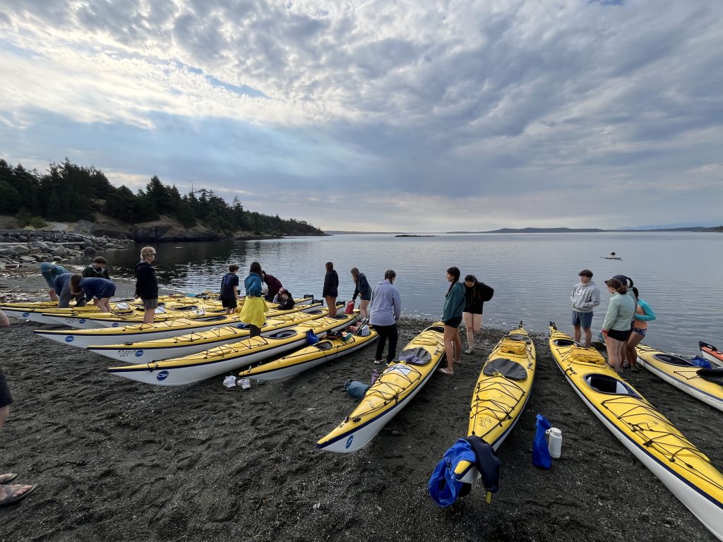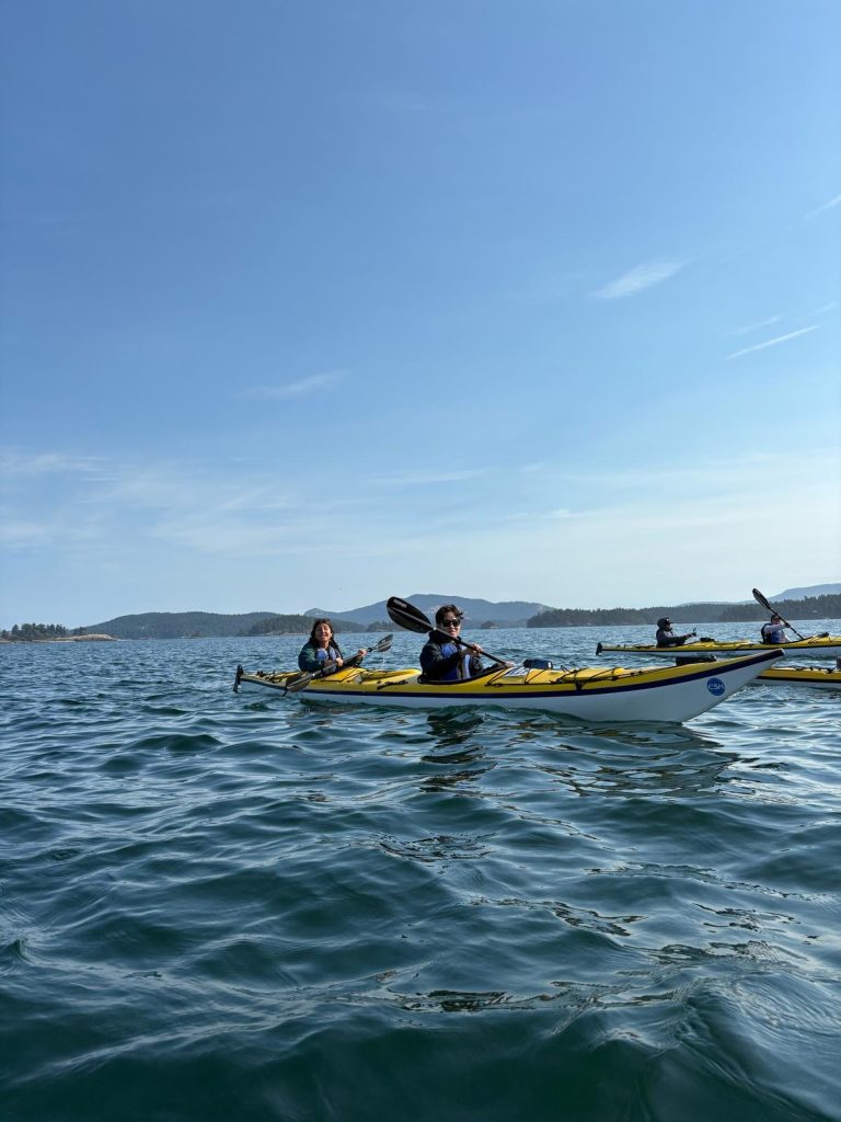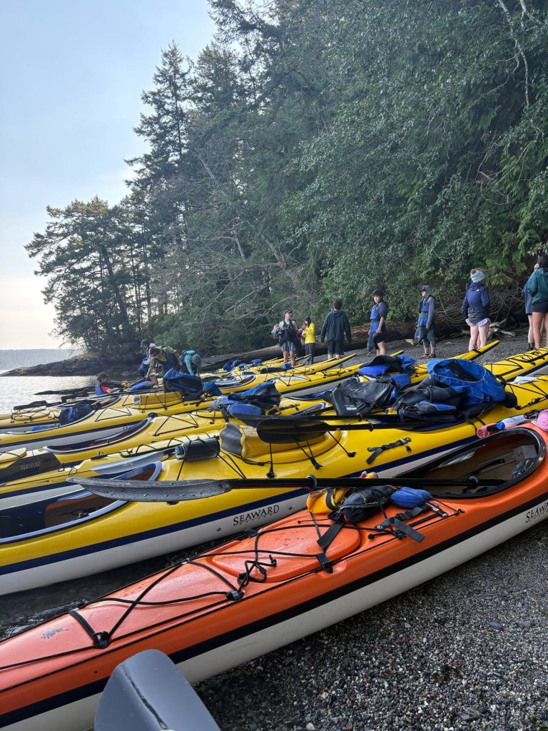 The final destination after lunch was a thin strip of rocky shoreline, just a short paddle across the channel from Turn Island. We clamored out of our boats, eager to be back on solid ground and to say goodbye to the spray skirts (thick, skirt-like pieces of waterproof fabric) that kept us dry while kayaking. We carried the kayaks up a short dirt path lined with thickets of blackberries, where they were loaded onto two boat trailers. Although we were all aching for dry clothes, clean bathrooms, and warm showers, we were incredibly grateful for the kayaking journey.