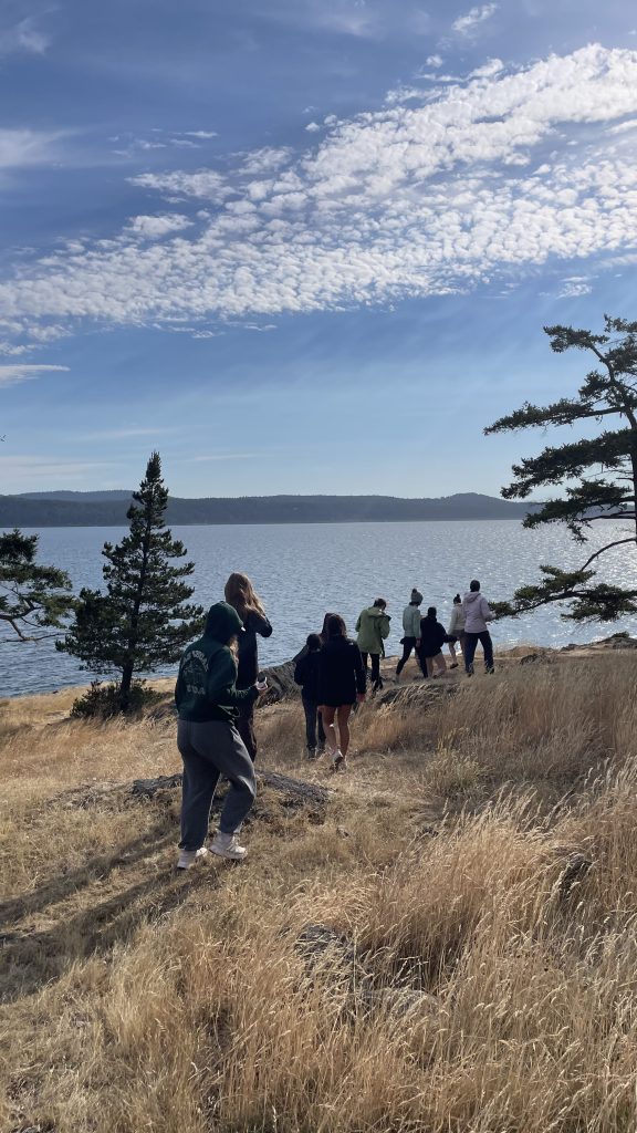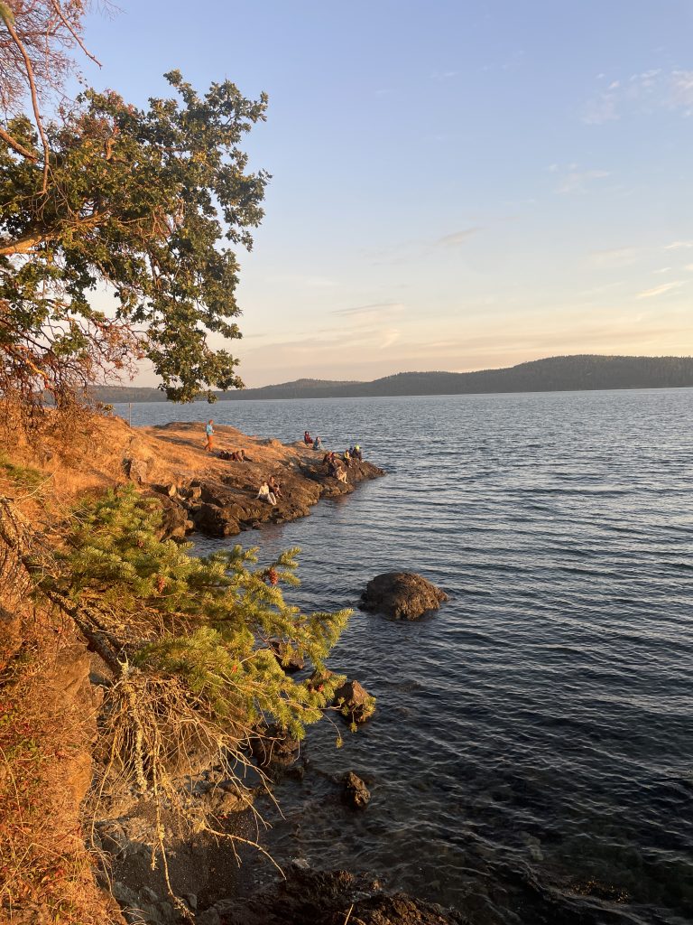 Once we had arrived at Jones Island, we quickly unloaded the boats and set up camp in a large field close to the shore. After getting settled, some of us went on to explore the island, while some of us went down to the beach to collect rocks. Everyone reconvened for dinner, which consisted of amazing tacos cooked by our kayak leads. After dinner the whole group walked to the west side of the island, which was blissfully sheltered from the howling wind, to watch the sunset.
