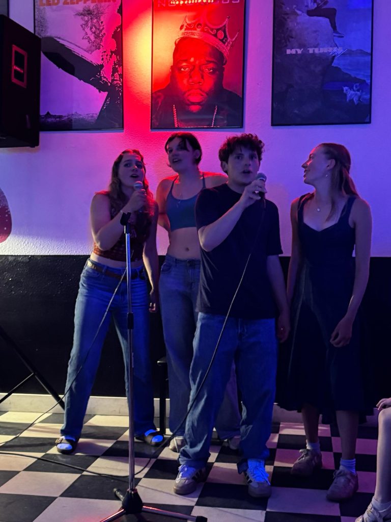 Kendall, Elle, Max, and Bryce singing Not Strong Enough by boygenius at JP’s karaoke night. Photo credit: Kaiya