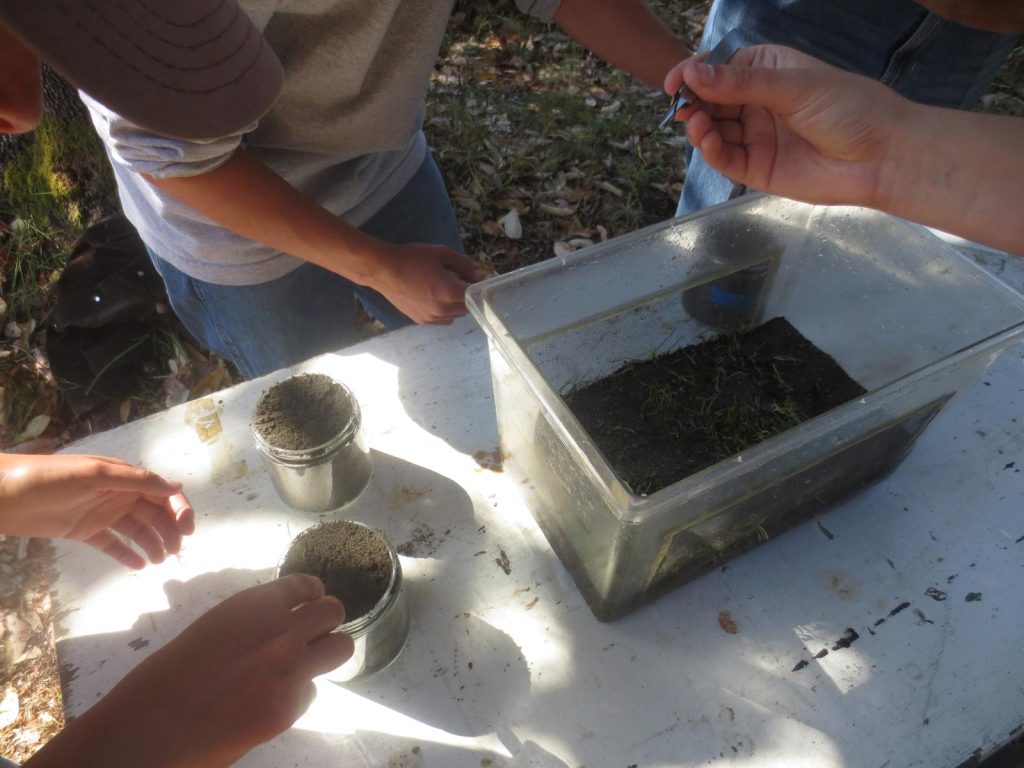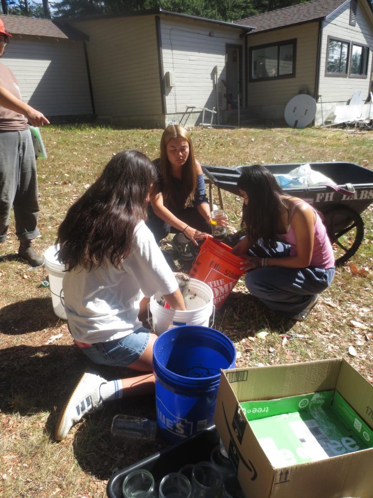 Kaiya, Avery, and Sophia scooping substrates from buckets into jars. Photo credit: Bryce