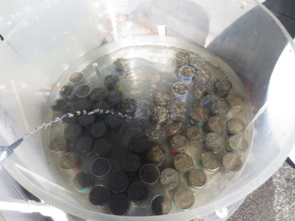 Uncovered water container holding assorted substrate jars of eelgrass seedlings. Photo credit: Bryce
