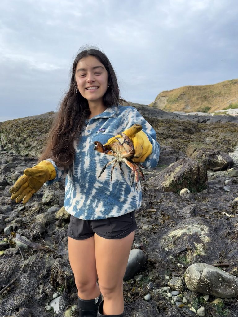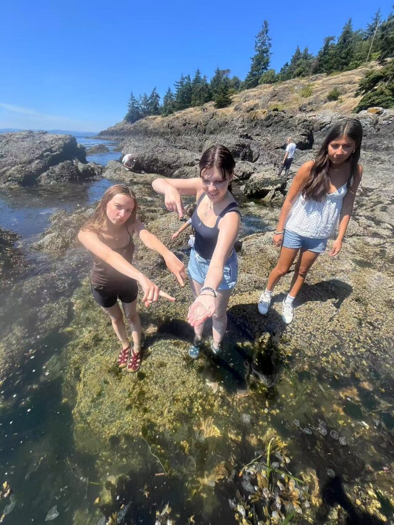 After lunch and a bit of project worktime, the cohort split into several groups to head out to different points on San Juan Island in order to collect data for their research projects. One group of four arrived to Reuben Tarte, a rocky beach with large amounts of seaweed covering the rocks, hills surrounding the water, and a bald eagle perched on an evergreen tree overhead. Two students set out a transect and collected crabs to determine the sex ratio among the population. Another student collected zooplankton from the water and measured the pH to determine pH’s effect on zooplankton. The last student randomly set down quadrats and measured the pH and biodiversity to determine their correlation to each other. Once each exhausted student finished collecting data it was a peaceful ride with Riley back to the dorms.
