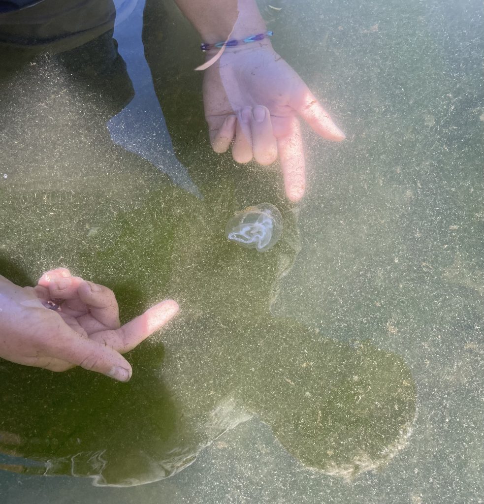 Observing a cross jellyfish at 4th of July Beach (photo by Violet)