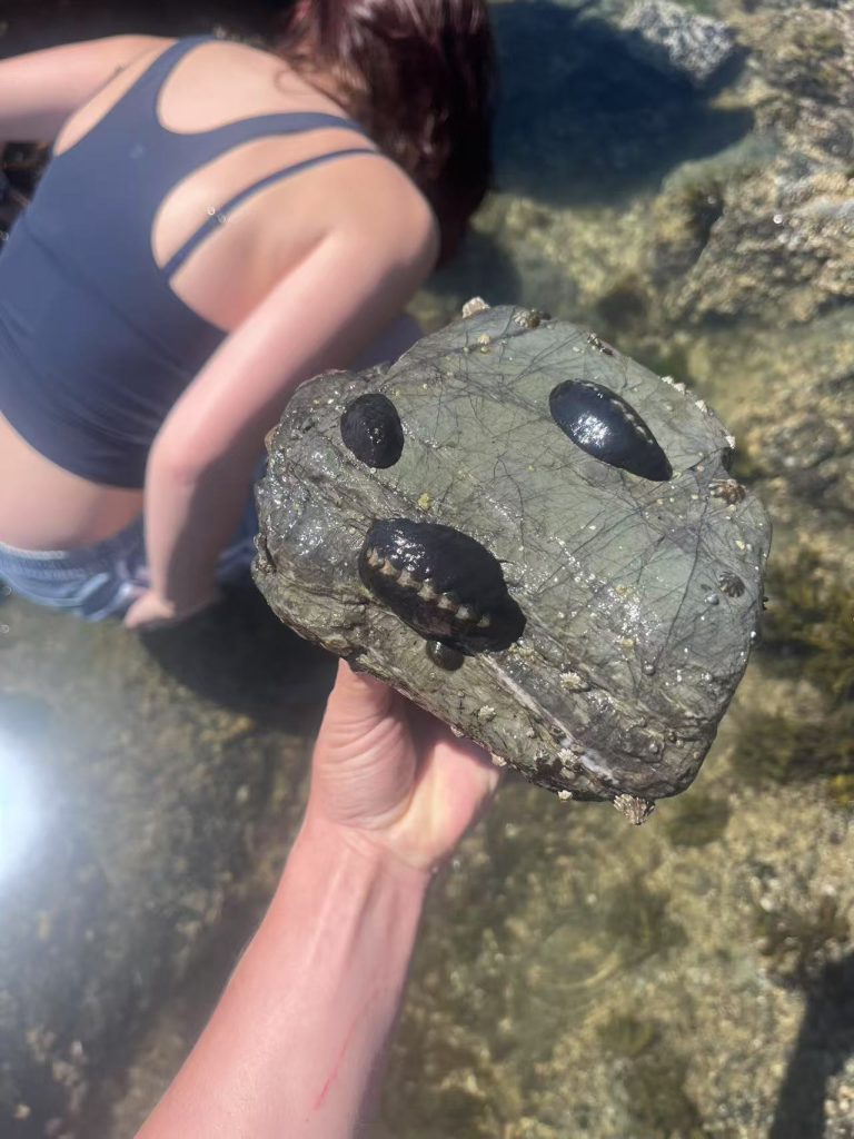 At the tidepools, we came across numerous diverse species, but something that caught our eye were the fossil-like chitons that stuck to the rocks. We later found that chitons are characterized by their eight shells and are members of the phylum Mollusca, a species that has an incredibly muscular foot, allowing them to hold on to various surfaces. Pictured below are three hairy chitons (Pos M. ciliata). These chitons were found after turning over a rock.