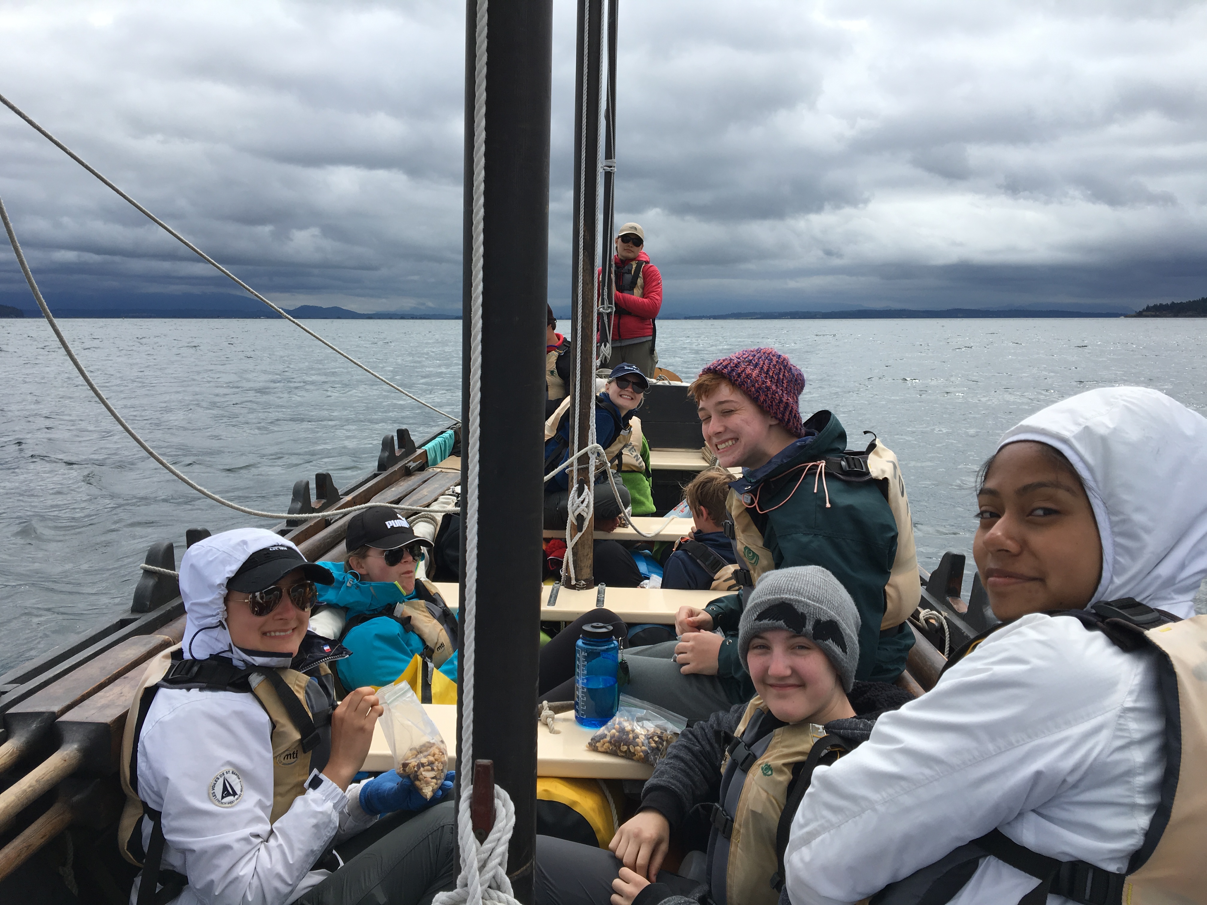For breakfast, we had oatmeal and tea/hot chocolate. After the first meal of the day, we finished packing (with great help from the Bosuns) and set off for our first official journey on the longboat. This four hour long journey included some practice drills such as the ‘Man Overboard’ and the ‘Squall’ as well as some shanty songs.